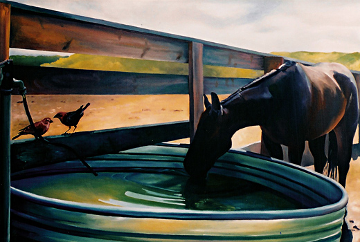 Susan Sheets is a well known and respected Texas artist, whose works have focused on rugged landscapes, livestock and wild animals native to Texas. Through her strong sense of design and her intense conviction, her paintings bring you into her life. Indeed you feel as if you are in the presence of her horses, rocks, and trees, for there is an immediate intimacy with her paintings.